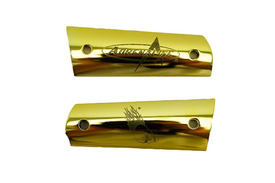 The Adrenaline Luxe Gold Plated Mechanical Grips are electrocless gold plated aluminum grips machined by Adrenaline. While standard 1911 grips have universal latch and safety cuts, these grips were custom designed for the Adrenaline Luxe and DLX Luxe TM40 and IDOL mechanical frames. Each set includes 4 extended length stainless steel screws to secure it to the frame.