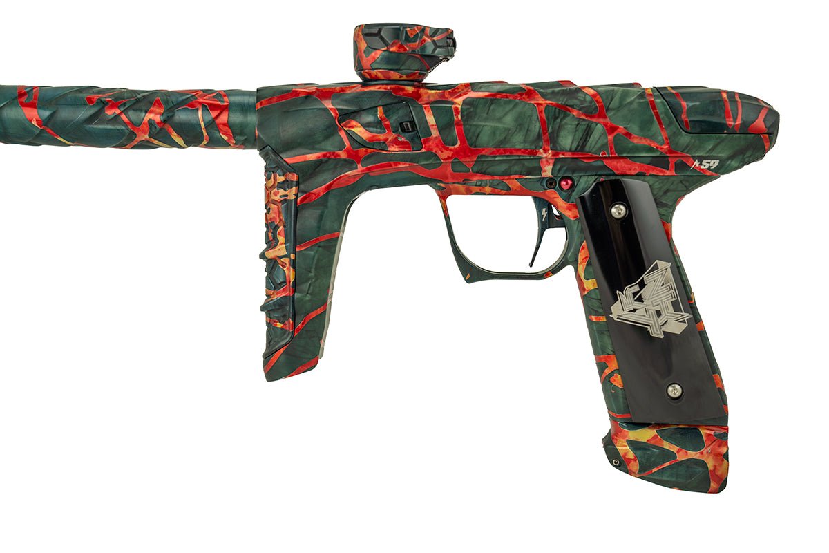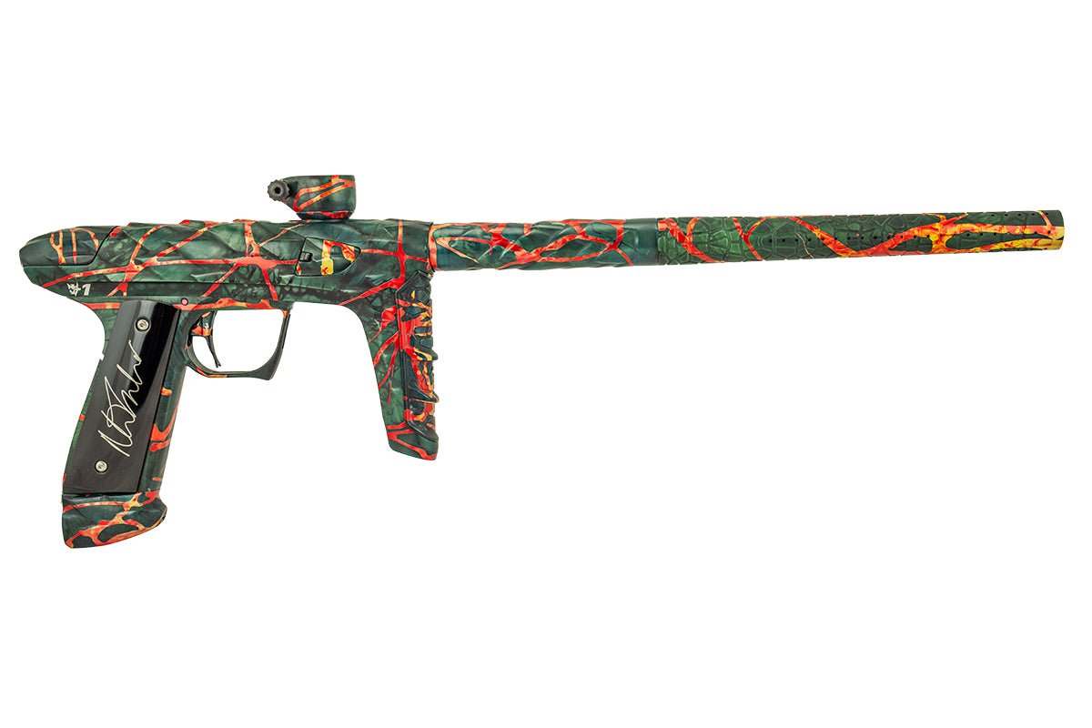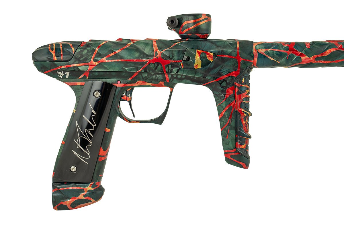 Adrenaline Luxe IDOL in Nicky T's finish which is a dust dark green, charcoal and black marble wash with polished orange, red and yellow washed splash. Signature Series Adrenaline Luxes include Signature Series anodizing, custom mechanical wood grip in applicable Signature Series pattern and separate serial number on right side of the unit in that limited edition Signature Series run.