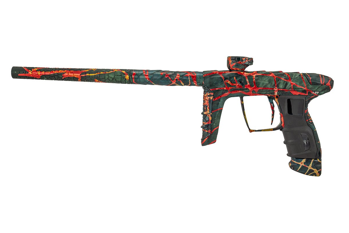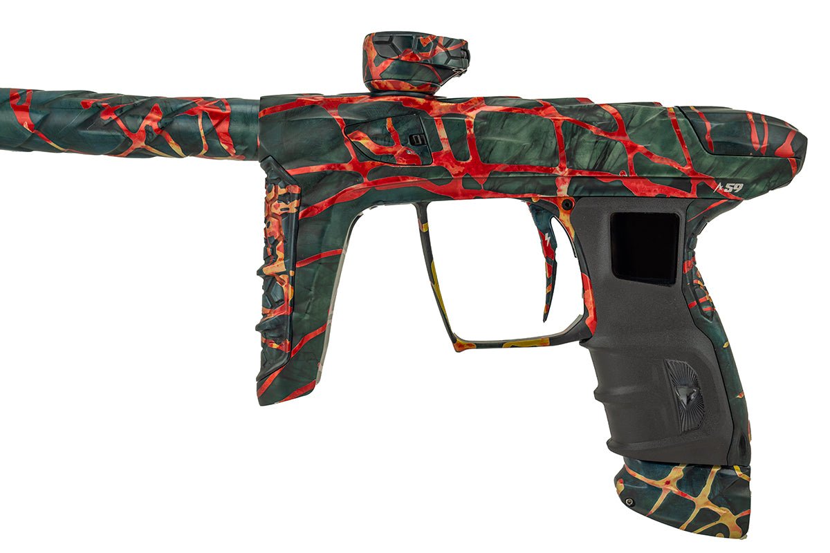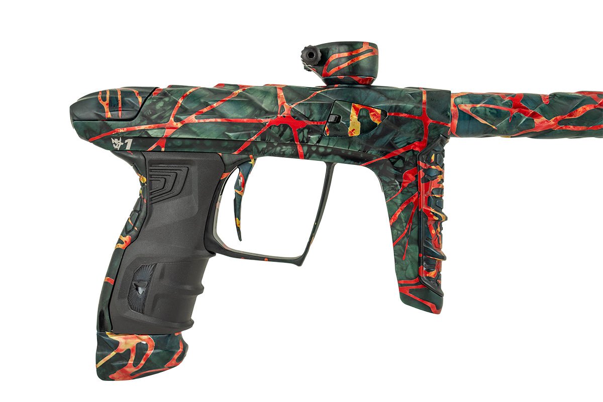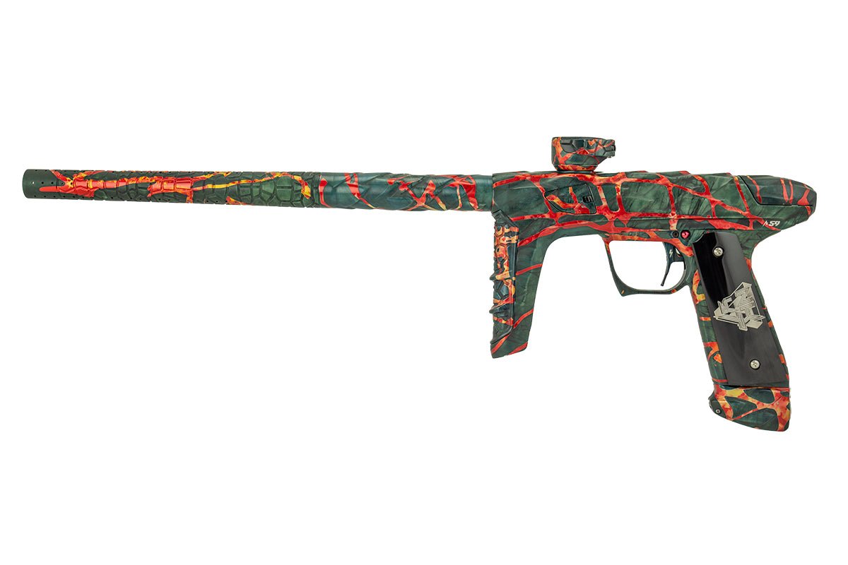 Adrenaline Luxe IDOL in Nicky T's finish which is a dust dark green, charcoal and black marble wash with polished orange, red and yellow washed splash. Signature Series Adrenaline Luxes include Signature Series anodizing, custom mechanical wood grip in applicable Signature Series pattern and separate serial number on right side of the unit in that limited edition Signature Series run.